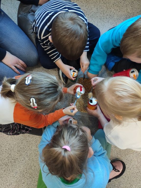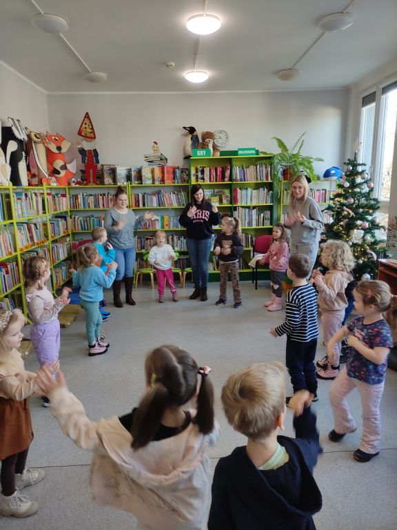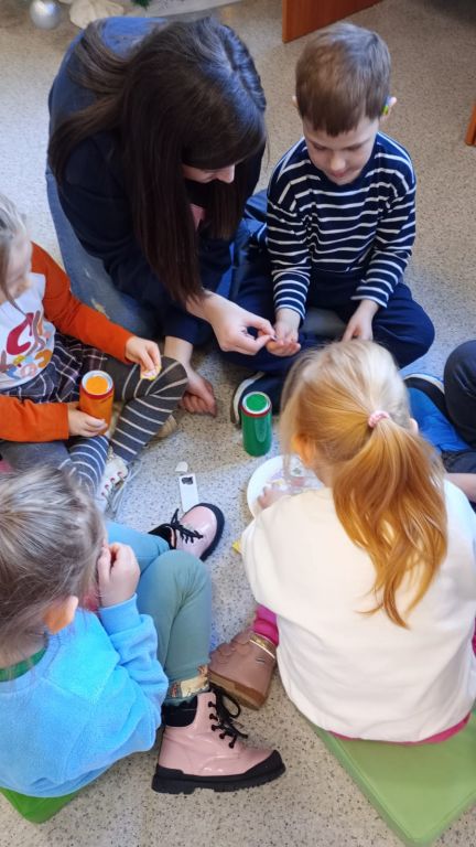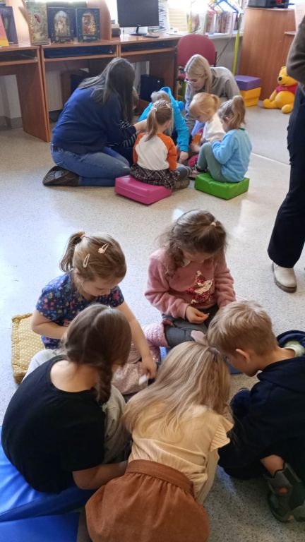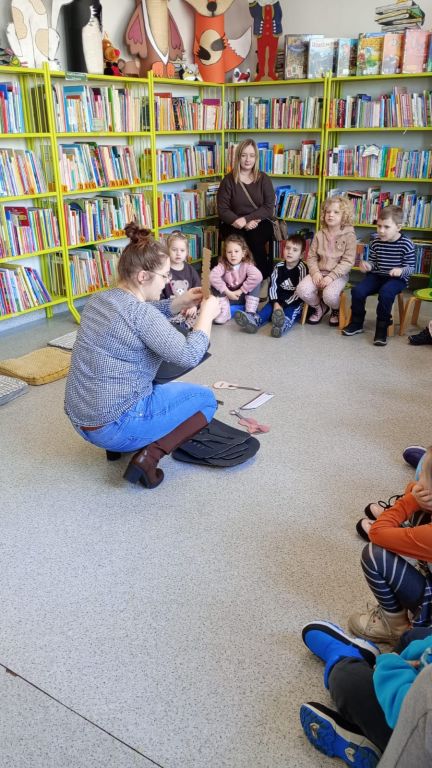 Skoro to święto, to nie mogło zabraknąć muzyki, śpiewów i tańca. Dlatego nasze spotkanie rozpoczęliśmy od wspólnego czytania książeczki o puchatkowej kapeli. Następnie dzieci wymieniały znane im instrumenty, a Pani Bibliotekarka dodała do tej grupy jeszcze nasze buzie. W związku z tym zrobiliśmy wspólną rozgrzewkę buzi wydając z siebie różne odgłosy. W kolejnym zadaniu dopasowywaliśmy usłyszane dźwięki do odpowiednich instrumentów, a te do odpowiednich futerałów. Podczas naszych zajęć nie zabrakło też zabawy ruchowej do lubianej przez najmłodszych piosenki „Ja gram na gitarze”. Po tych wesołych pląsach dzieci miały okazję zrobić samodzielnie grzechotki, które następnie pięknie ozdobili.