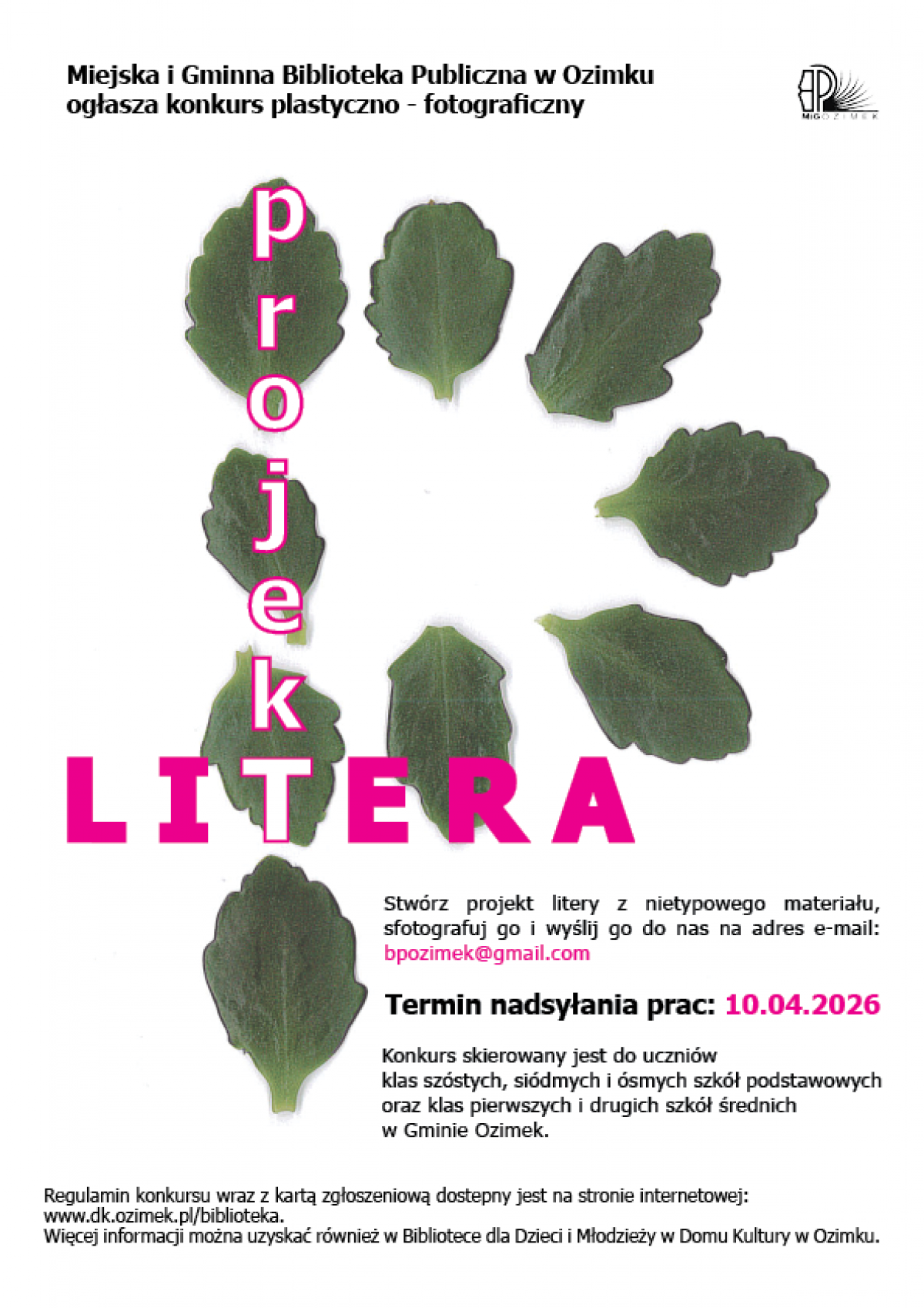 Oddział dla Dzieci i Młodzieży Miejskiej i Gminnej Biblioteki Publicznej w Ozimku ogłasza konkurs plastyczno - fotograficzny pn. "Projekt Litera". Rozwiń skrzydła swojej kreatywności: stwórz projekty liter z nietypowego materiału, sfotografuj je i wyślij do nas.